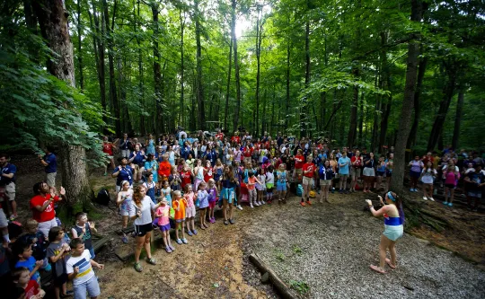 Campers take a swim test, tour camp, meet their cabinmates, enjoy dinner, and kick off the week with Opening Campfire.
